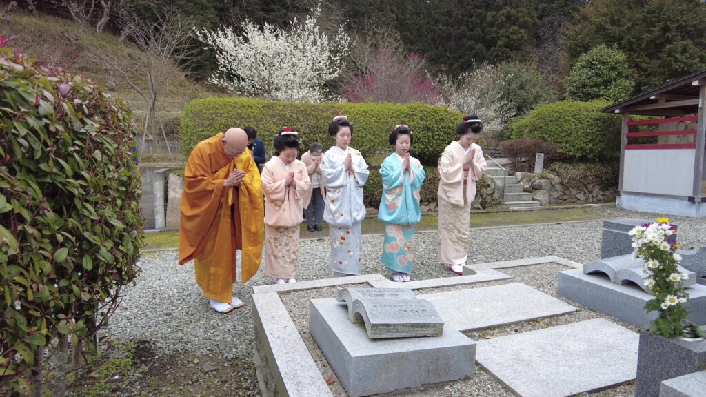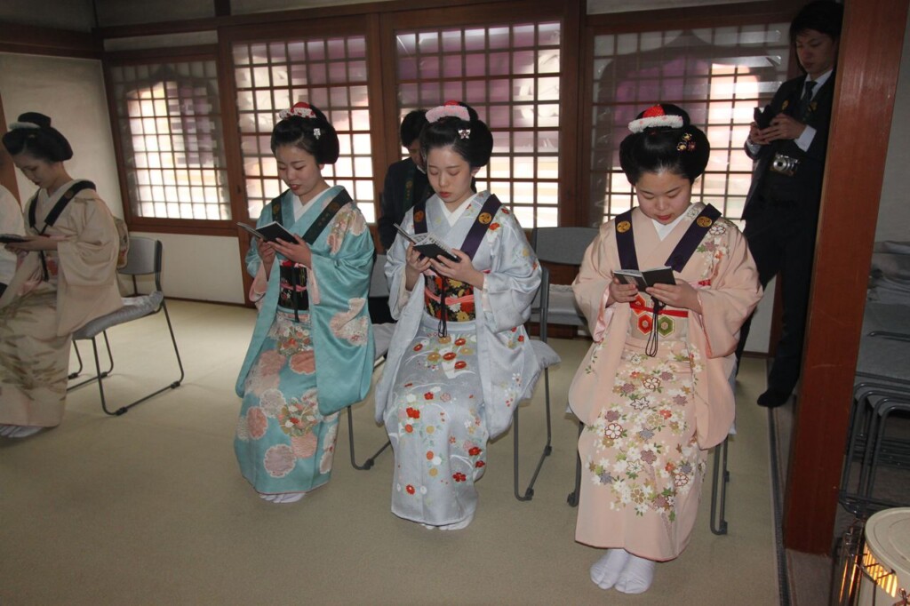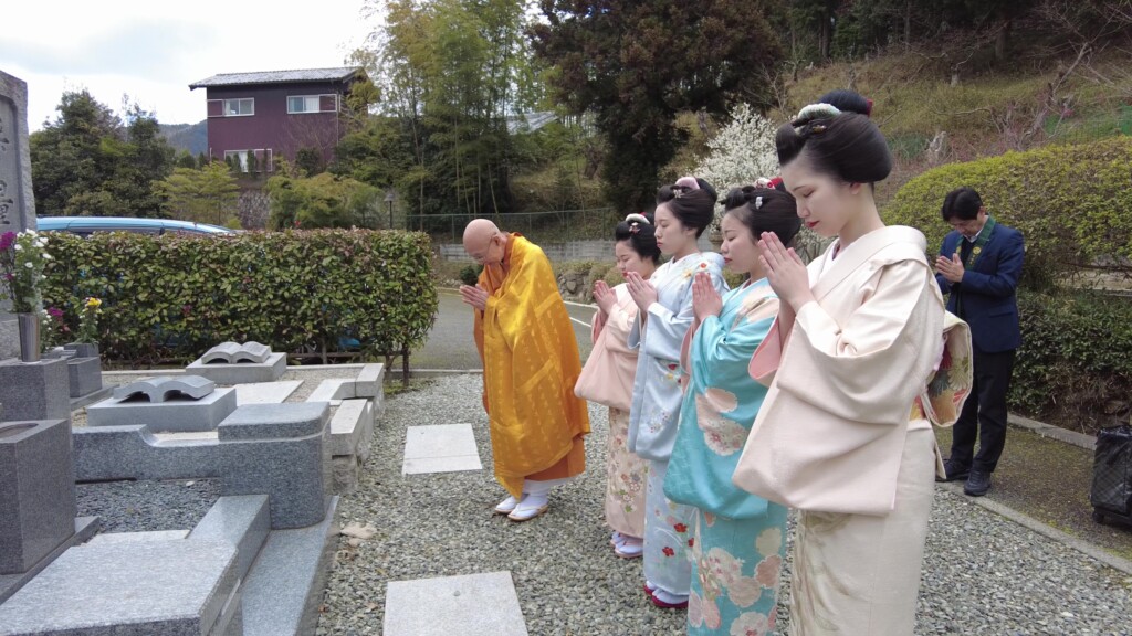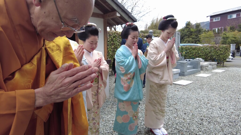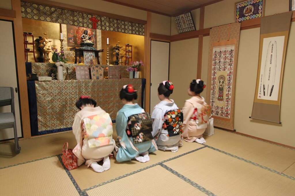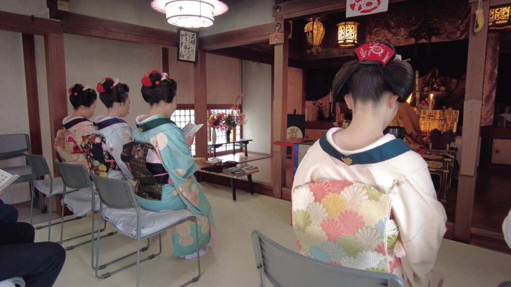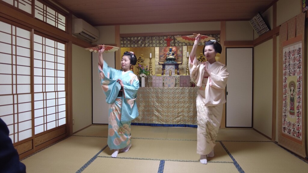 奉納の舞の最後は、全員で礼儀正しく正座し、仏壇にお礼をされておりました。10代後半の若い女性とは思えない清楚な立ち振る舞いは、さすが芸事の修行をされている方々だと感心させられました。