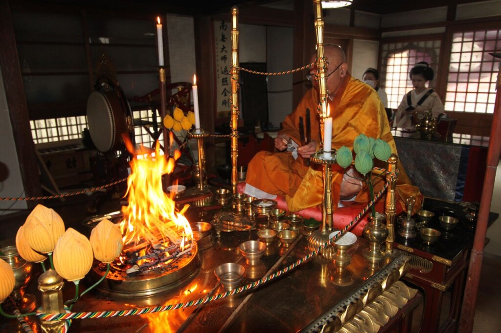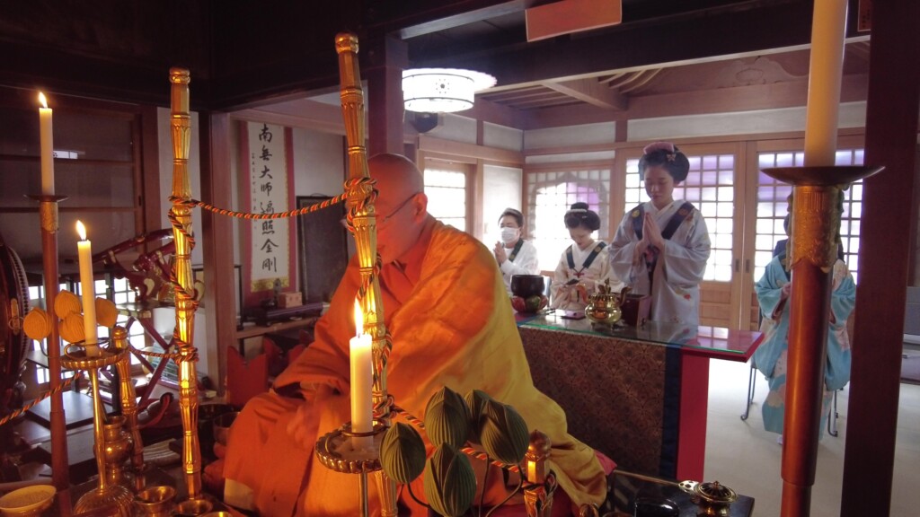 真剣にお経本に目を落とし、また護摩の炎を真剣な眼差しで見入る姿には感銘を受けると同時に、お寺と舞妓という、まさに日本が育んできた伝統の素晴らしさが、そこには如実に表現されているように感じられました。